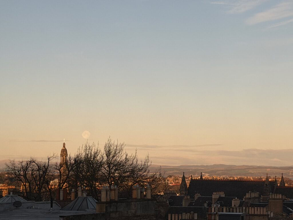 Full moon… blue skies… morning walk… Scott Monument… Norwegian Christmas Tree… Writers/ Museum… Diagon Alley… Tron Kirk Market… Roof Terrace… Pho… Nam… yum!