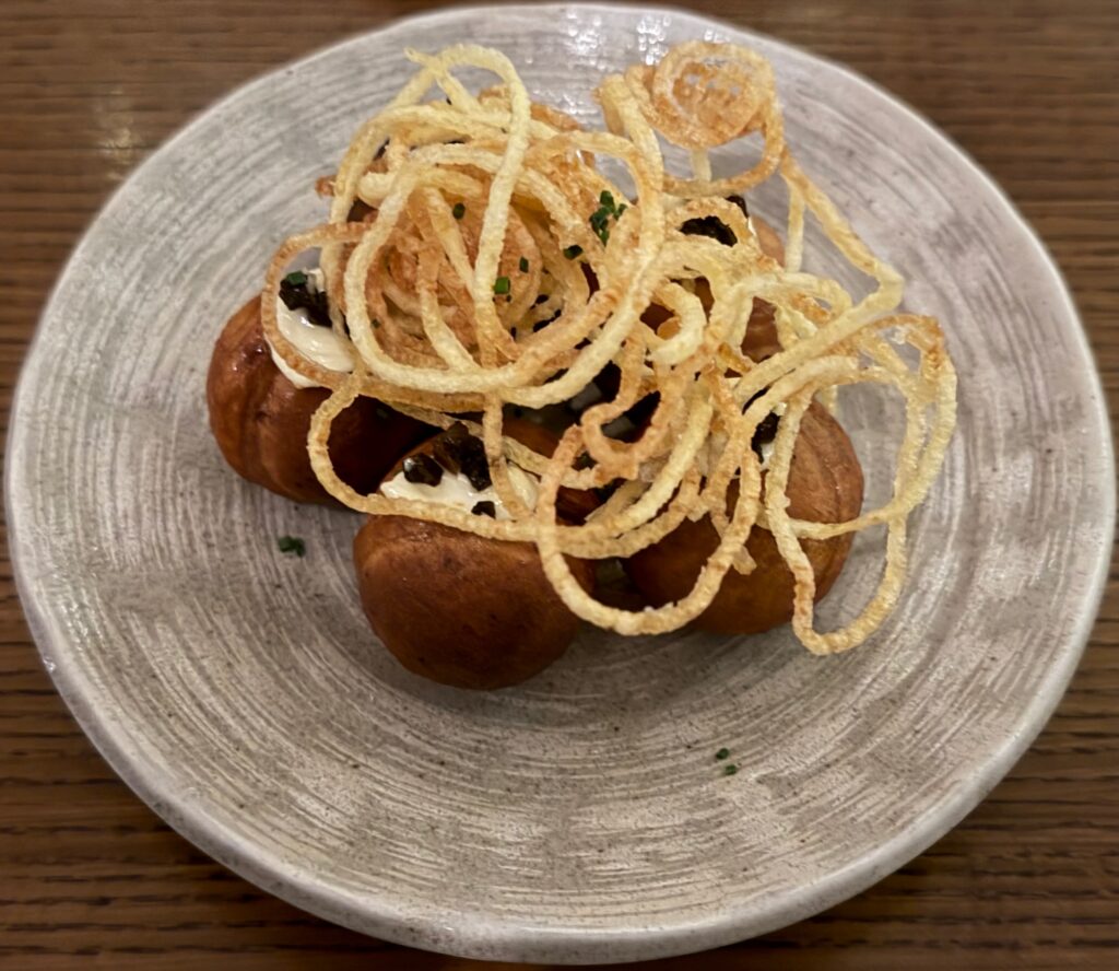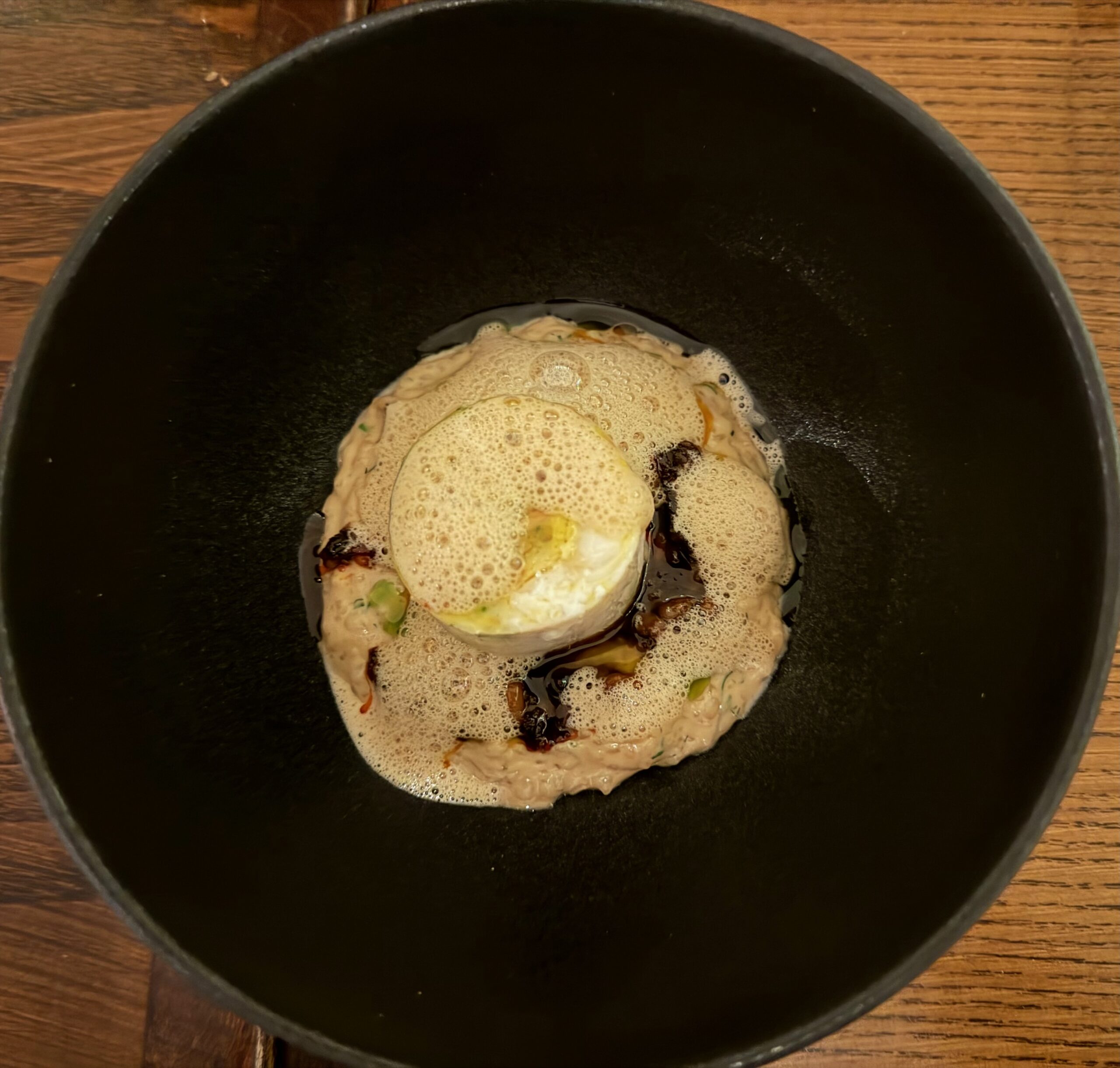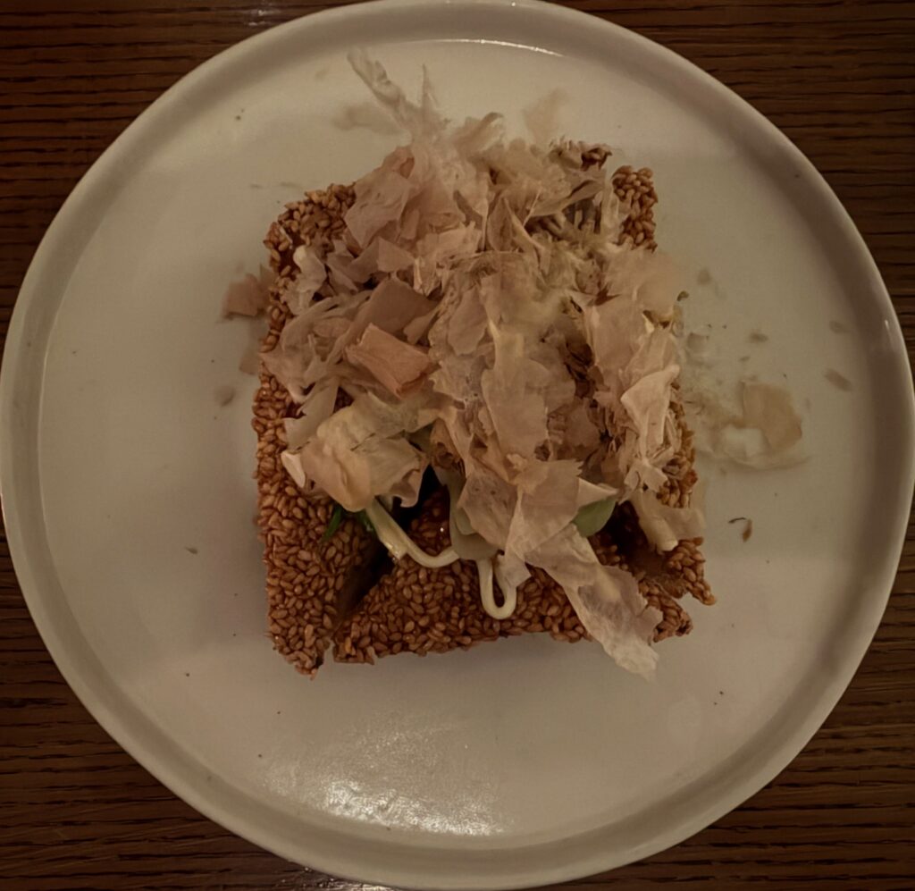 Bing bread… north sea crab… sashimi… arbroath smokie chawanmushi… fried shiitake doughnut… okonomiyaki… potato udon… chocolate miso bar, hazelnut, toasted milk… yumminess on little plates!