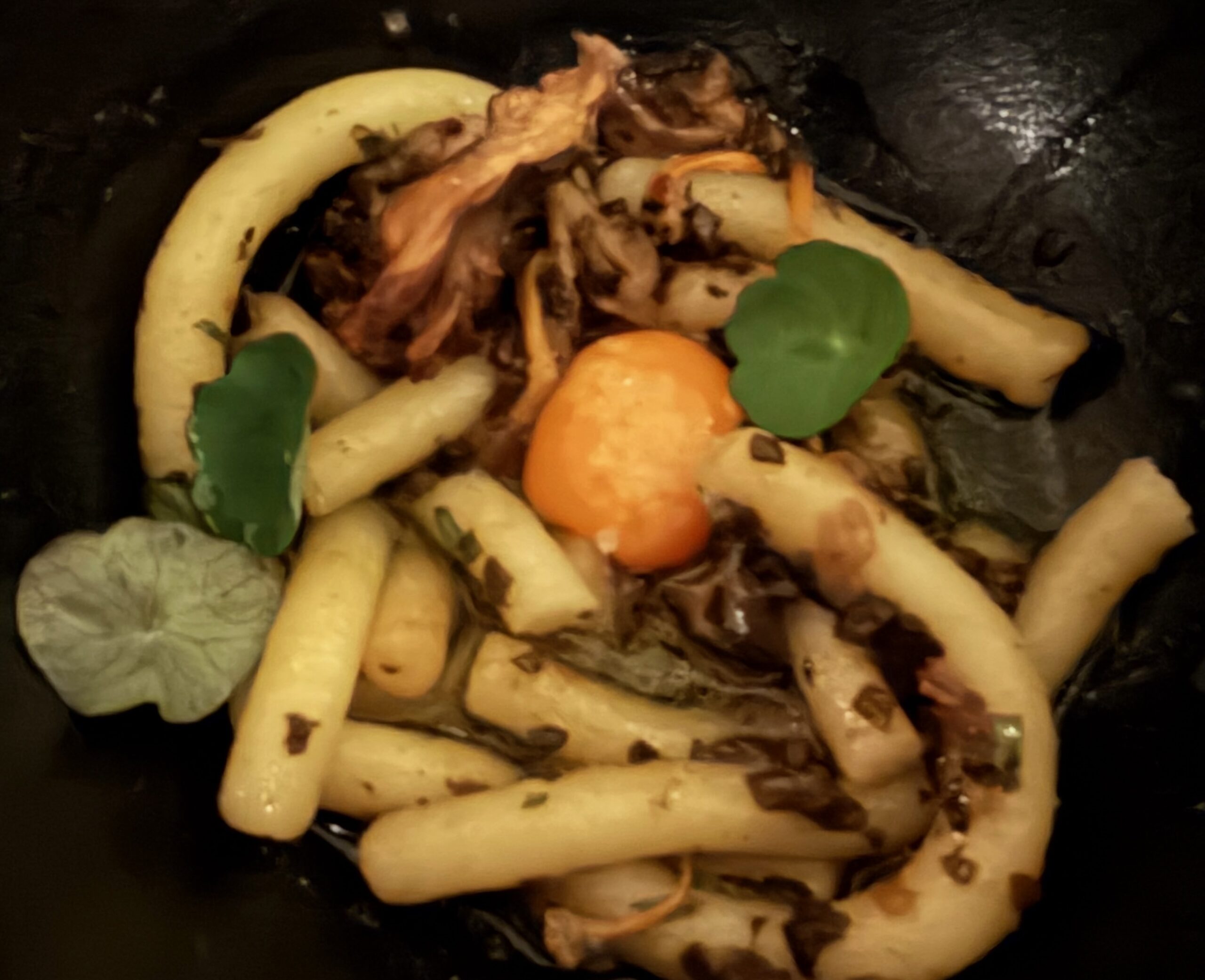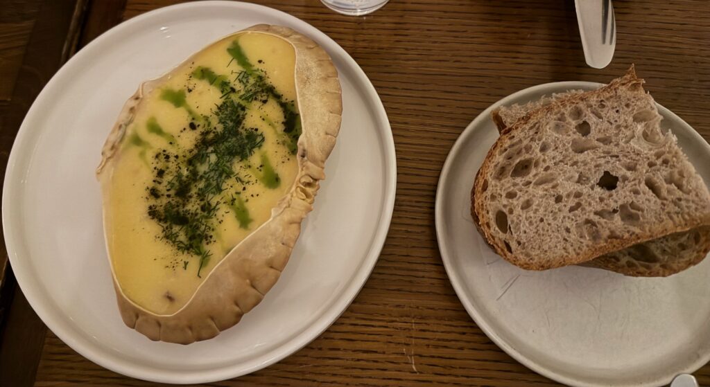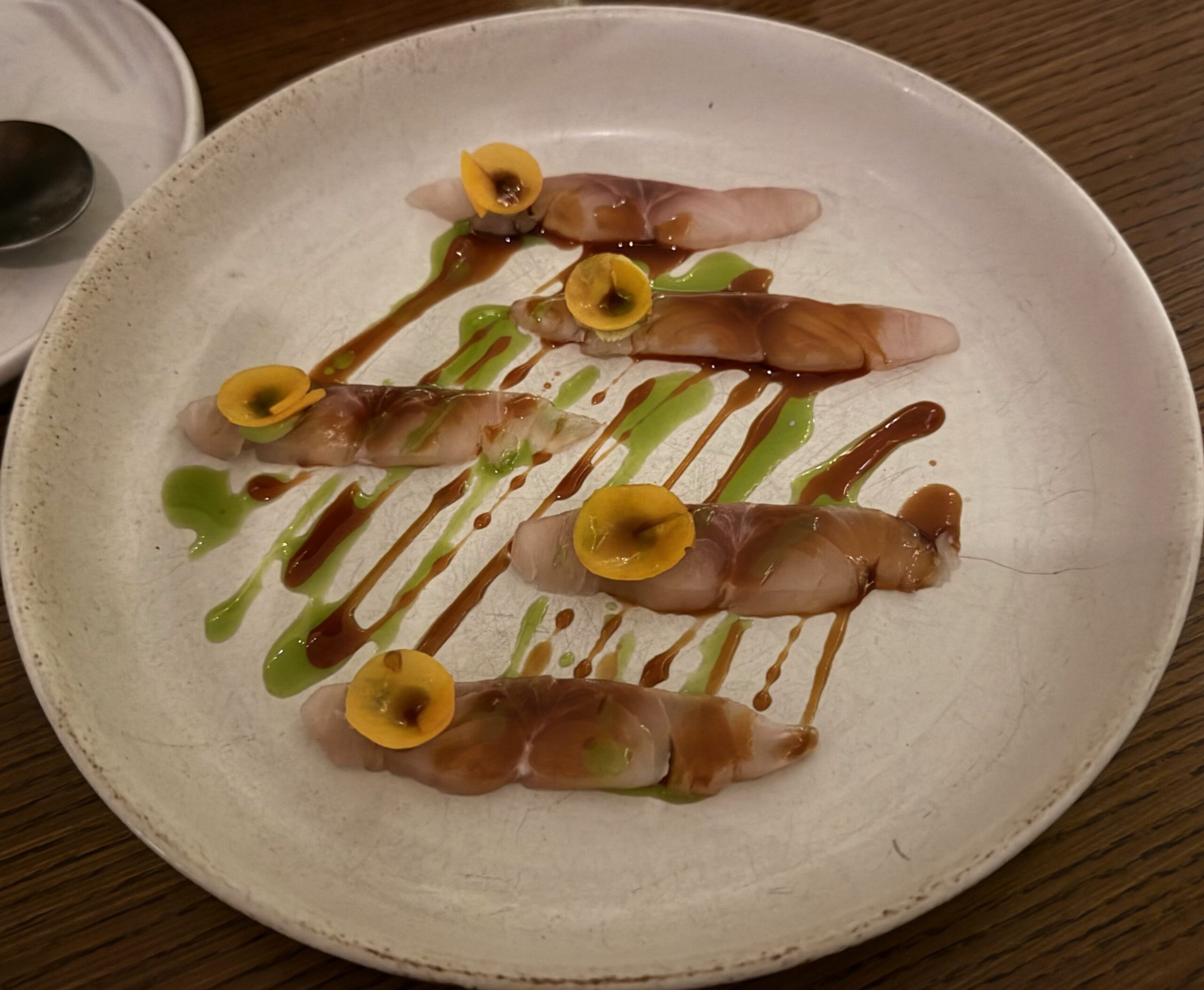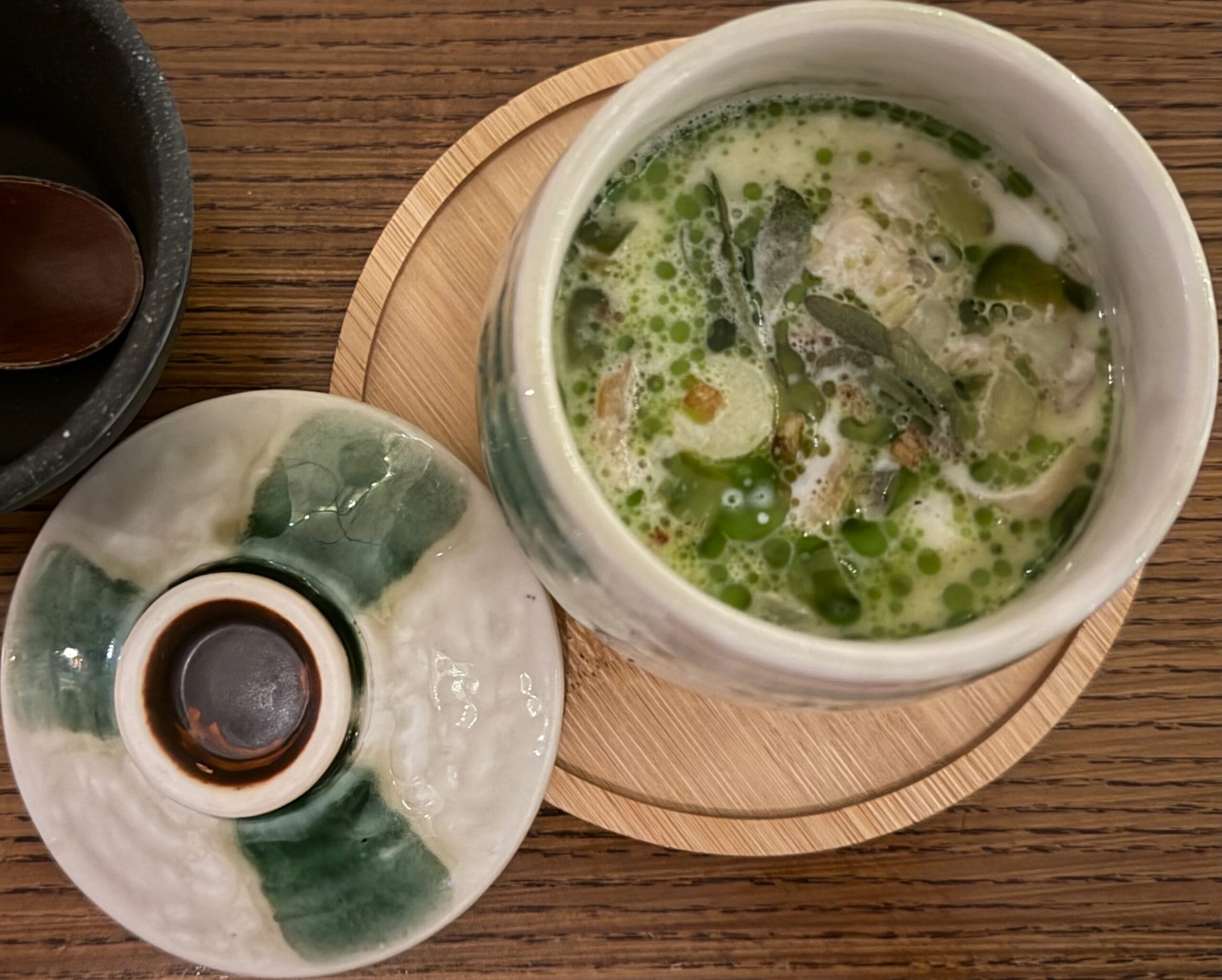 Bing bread… north sea crab… sashimi… arbroath smokie chawanmushi… fried shiitake doughnut… okonomiyaki… potato udon… chocolate miso bar, hazelnut, toasted milk… yumminess on little plates!